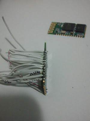 Após estabelecer conexão comecei a brincar com o módulo enviando comandos e a coisa não funcionou bem como eu esperava. Lendo este documento, descobri que os módulos que eu tenho aqui possuem firmware HC-06 e que só funcionam no modo escravo e a lista de comandos AT pode ser encontrada aqui. Isso me deixou um pouco decepcionado pois eu esperava pelo menos poder ter autonomia sobre os diversos pinos de IO (tive trabalho danado pra soldar todos eles e agora descobri que não serviu pra nada...).
